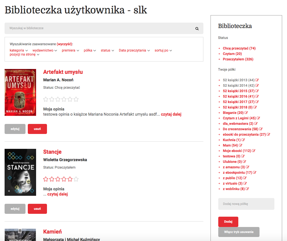@MonikaP Logujesz się w serwisie, wchodzisz na panel użytkownika -> Biblioteczka i powinnaś widzieć coś takiego, jak na obrazku pod linkiem: https://www.granice.pl/images_extra/do_tekstow/2018/2018_01/biblioteczka.png. W prawej części strony masz panel zarządzania biblioteczką - na dole jest „włącz tryb usuwania" - dzięki niemu możesz usuwać półki. Rzecz na pewno działa na komputerach. |