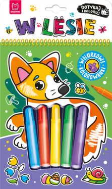 ,,Dotykaj i koloruj. W lesie" to kolorowanka sensoryczna z dołączonymi pisakami. Tło obrazków pokrywa czarny welur, który podkreśla głębię kolorów, zapewnia wrażenia sensoryczne i ogranicza wychodzenie poza linię. Małych fanów i fanki zwierząt czeka spotkanie z mieszkańcami lasu. W gronie leśnych zwierząt w książce znajdują się: borsuk, dzik i sowa, bobry, niedźwiedź, jeleń, wilk i nietoperze, wiewiórki, zajączek. Dzieci nie tylko pokolorują 8 uroczych rysunków. Przeczytają również wierszyki o zwierzętach z ilustracji. A dzięki perforacji pokolorowaną pracę mogą oderwać, włożyć do ramki i podarować w prezencie lub ozdobić nią pokój.