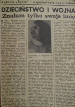 Wspomnienia dorosłych, którzy będąc dziećmi przeżyli piekło wojny i odpowiedzieli na apel "Życia Warszawy", które zwrócło się z prośbą o nadsyłanie swych wspomnień, pod hasłem: wojna w oczach dzieci.