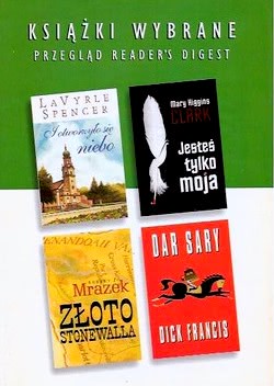 Książki Wybrane to niezwykle oryginalny pomysł wydawniczy. Każdy tom zawiera cztery specjalnie zredagowane najnowsze światowe przeboje literackie. Sławni autorzy, najlepsze powieści, solidna oprawa i gustowna szata graficzna. JESTEŚ TYLKO MOJA - Mary Higgins CLARK Romantyczna wycieczka na pokładzie luksusowego statku pasażerskiego. Do wielu samotnych kobiet marzących o spotkaniu swego ideału, to wprost wspaniała okazja. Nie wiedzą jednak, że czarujący wielbiciel, nieodstępujący ich na krok, jest całkowitym zaprzeczeniem takiego ideału. DAR SARY - Dick FRANCIS Młody Ben Juliard zgadza się zrezygnować na jakiś czas ze swojej pasji dżokerskiej, aby pomóc ojcu w walce o ważne stanowisko w parlamencie. Wkrótce obaj się przekonają, że to współzawodnictwo jest pełne niebezpieczeństw. Kampania polityczna wymaga przebiegłości i i podejmowania ryzyka... I OTWORZYŁO SIĘ NIEBO - La Vyrle SPENCER Kiedy Anne i Lucy Olczak tracą matkę, ich nauczycielka - siostra Regina - stara się pomóc dziewczynkom i dodać otuchy zrozpaczonemu ojcu. Zakonnica stanie przed trudnym zadaniem pogodzenie surowych reguł zakonu z porywami własnego serca. ZŁOTO STONWALLA - Robert J. MRAZEK Debiutancka powieść byłego kongresmena zwraca uwagę dbałością autora o realia historyczne i autentyczność dialogu. Jej wartka akcja toczy się w ostatnich dniach wojny secesyjnej. Złoto Stonwalla to barwna opowieść, gdzie romans przeplata się z przygodą i heroizmem.