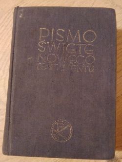 Stare wydanie Nowego Testamentu. Znajdują się tam Ewangelie i Listy. Zaczyna się od Ewangelii wg św. Mateusza, przechodzi do Dziejów Apostolskich, zachacza Pierwszy List do Koryntian i List do Filipian. Po drodze znajdują się jeszcze Ewangelie wg św. Marka, Łukasza i Jana. Do tego nie zabrakło Listów do Galatów, Tesaloniczan i Hebrajczyków. Pismo kończy Apokalipsa św. Jana. Pięknie wydana, delikatna książka.