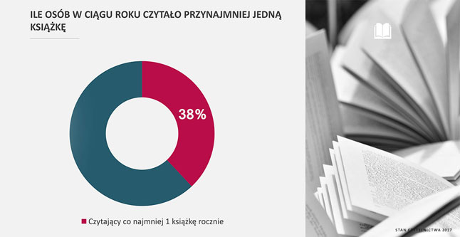 Co najmniej jedną książkę w ciągu roku przeczytało 38% Polaków – dowiadujemy się z najnowszych badań Biblioteki Narodowej, które opublikowano w czwartek 15 marca. To podobny wynik jak w kilku ostatnich latach. Po wyraźnych spadkach przypadających na okres 2004–2008 poziom czytelnictwa w Polsce ustabilizował się na poziomie nieco poniżej 40%. Podobnie stabilna jest liczba tzw. czytelników intensywnych, czyli osób deklarujących czytanie 7 i więcej książek rocznie: w ostatnim pomiarze było ich 9%. Pełny raport ukaże się w maju.
