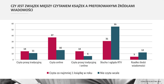Badanie preferowanych źródeł wiadomości i ich związku z czytelnictwem wykazało, że osoby deklarujące się jako czytelnicy książek najchętniej czerpią wiadomości o świecie także za pośrednictwem lektury, często online (37%), podczas gdy nieczytający wybierają przede wszystkim radio i telewizję (55%).