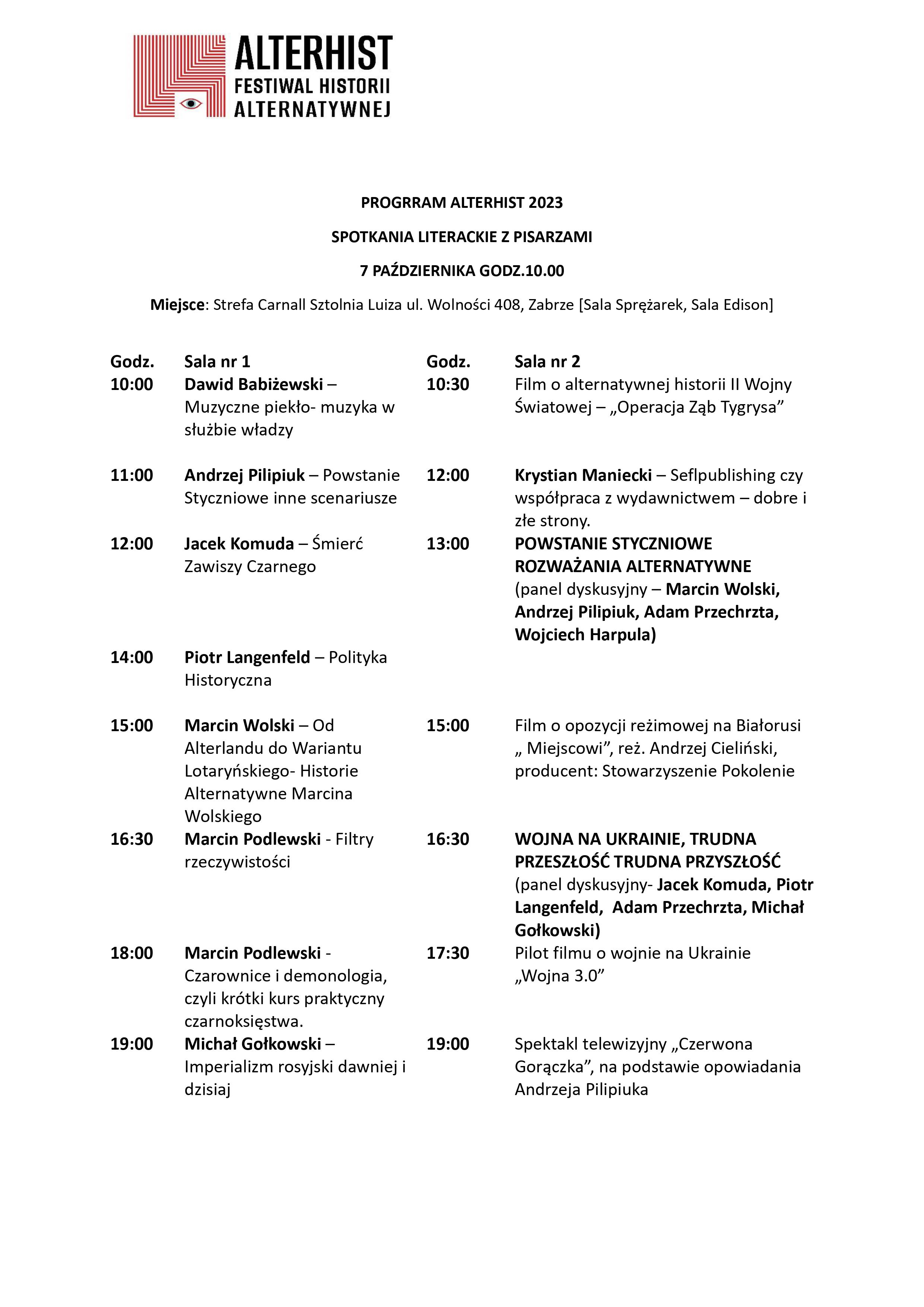 Festiwal Alterhist 2023 rozpocznie się o godz. 11.00. Jak co roku odbędą się prelekcje i spotkania autorskie z popularnymi pisarzami z nurtu fantastyki, historii, a przede wszystkim historii alternatywnej. Tematem wiodącym Alterhist 2023 będzie Powstanie Styczniowe (w ujęciu historii alternatywnej), dodatkowo odbędą się prelekcje autorów na wybrane przez nich tematy np. Imperializm rosyjski dawniej i dzisiaj, Sztuczna inteligencja, symulacji, kwantyzacji i aparacie poznawczym oraz Czarownice i demonologia czyli krótki kurs praktyczny czarnoksięstwa.