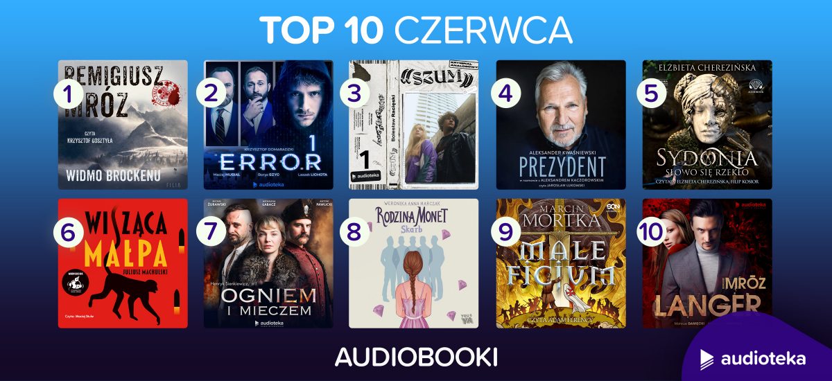 Nieco inaczej kształtuje się natomiast zestawienie najchętniej słuchanych audiobooków w czerwcu, które przygotowane zostało przez platformę Audioteka. Choć niektóre z pozycji powtarzają się w stosunku do zestawień Empiku czy Taniej Książki, to jednocześnie w zestawieniu Aduioteki pojawia się wiele dotychczas niewymienionych pozycji.