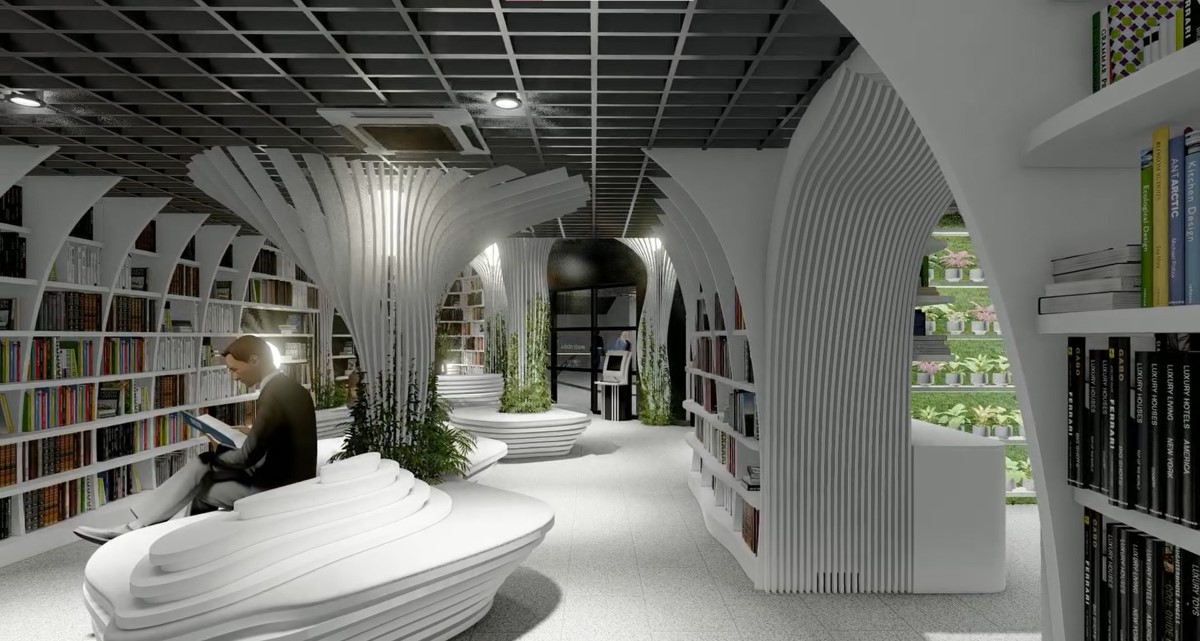 Przestrzeń biblioteki będzie miała charakter otwarty. Każdy wiec będzie się mógł w niej zatrzymać na lekturę dobrej książki, ale też chwilowy odpoczynek. Projekt całego wnętrza i mebli został zaczerpnięty z nowoczesnej technologii parametrycznej. W strefie otwartej znajdzie się: strefa ekspozycji książek, strefa galerii i spotkań autorskich oraz strefa dla dzieci i młodzieży.