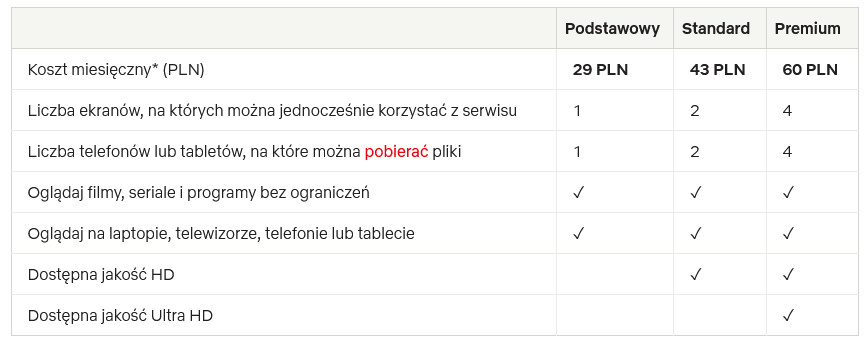Bez zmian pozostaje cena pakietu Standard, który umożliwia jednoczesne oglądanie produkcji na 2 urządzeniach. Za ten pakiet zapłacimy 43 złote miesięcznie.
