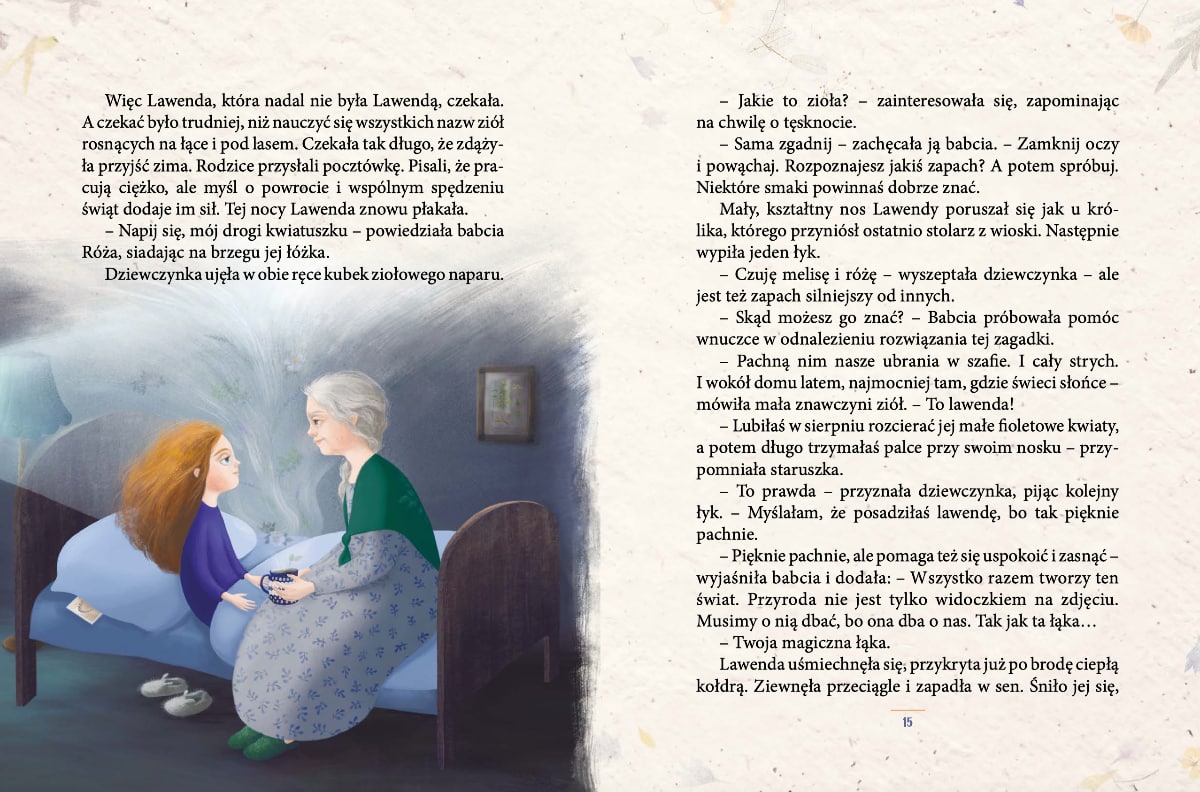 Lawenda była kiedyś zwyczajną dziewczynką o zwyczajnym imieniu. Gdy miała sześć lat, spędziła kilka miesięcy w otoczonym magiczną łąką domu swojej babci Róży. Właśnie tam za sprawą pewnego zdarzenia jej nos stał się lawendowy, dzięki czemu otrzymała wymarzone imię. Tam też rozbudziła się w niej miłość do wolności, bliskości natury, a także do pachnących ziół, o których tak wiele opowiadała jej babcia.
