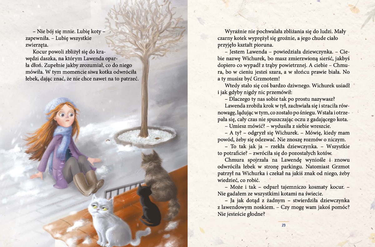 Historia o Lawendzie i gadających kotach to ciepła opowieść o przemianie i odkrywaniu tego, co najważniejsze. Książka Lawenda i gadające koty pomaga zrozumieć, że wszyscy dzielimy jeden świat, potrzebując siebie nawzajem. Do lektury zaprasza Wydawnictwo Lemoniada. Dziś na naszych łamach możecie zajrzeć do wnętrza tej książki: