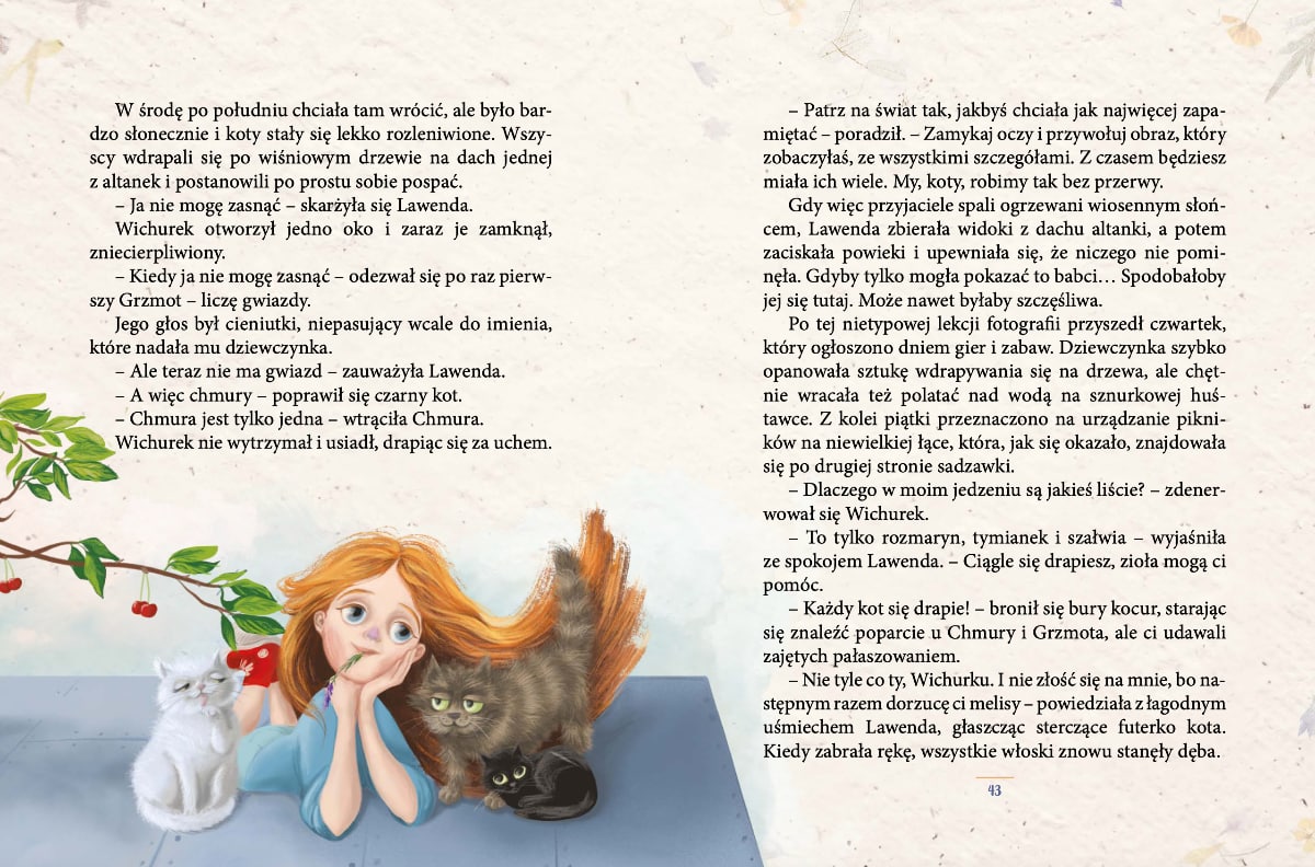 Dziewczynka dorasta, a wspomnienia wiejskiej sielanki wracają ze szczególną siłą, kiedy jako dziewięciolatka musi odnaleźć się w nowej rzeczywistości – w mieszkaniu na betonowym osiedlu dużego miasta. I wtedy nieoczekiwanie Lawenda spotyka na swojej drodze trzy niezwykłe koty, które będą jej towarzyszyć podczas poszukiwania własnego miejsca w świecie i poznawania jego dobrych stron. Pomogą także w spełnieniu pewnej obietnicy…