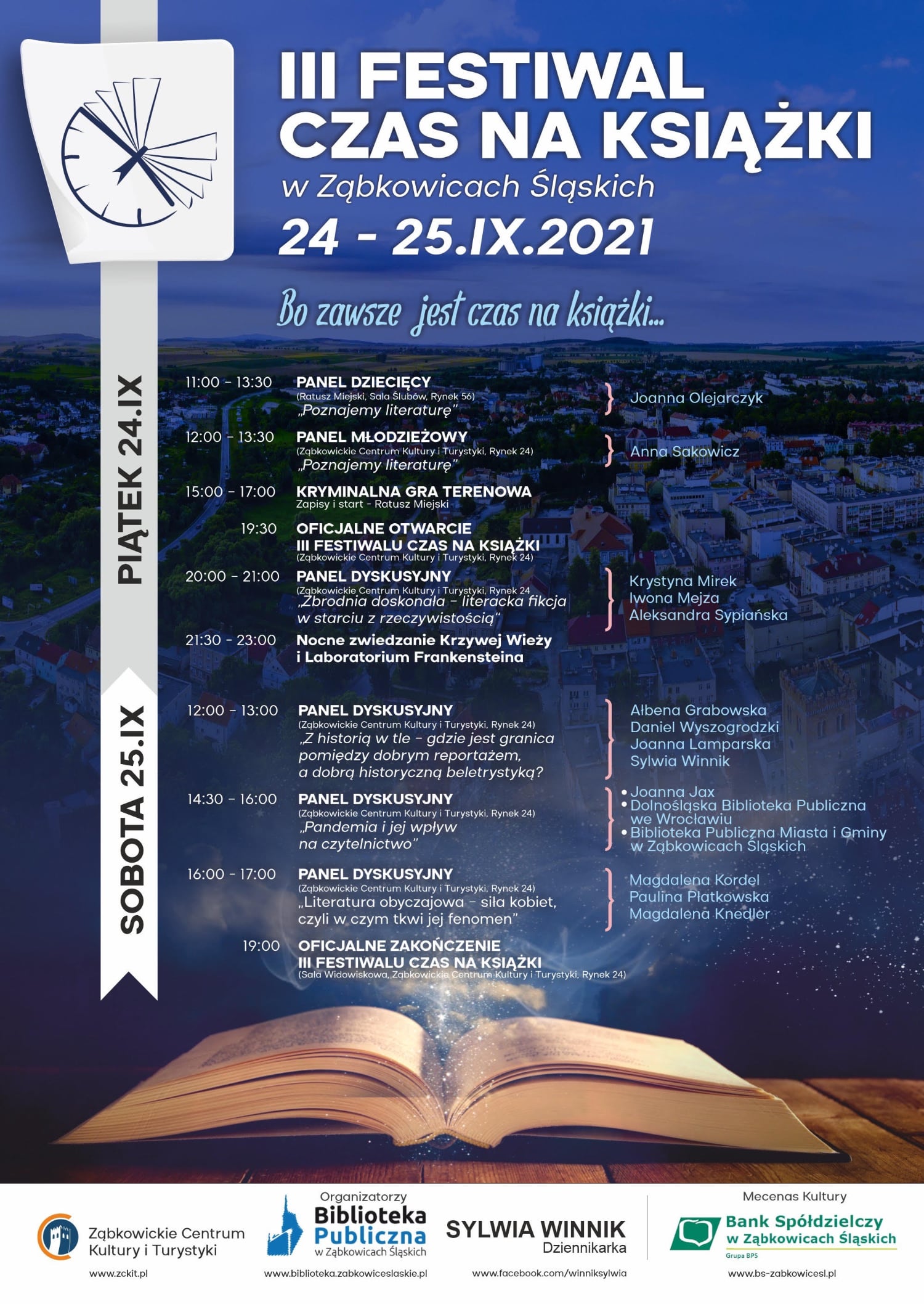 Zapraszamy do udziału w III Festiwalu „Czas na Książki", który odbędzie się w dniach 24-25 września 2021 roku w Ząbkowicach Śląskich – Mieście Krzywej Wieży i Frankensteina. Będzie to już trzecia edycja tego wydarzenia.