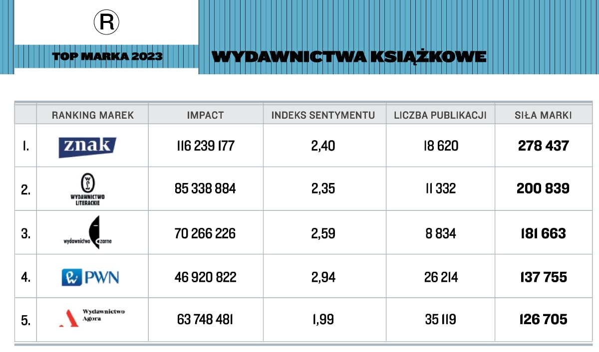 Najsilniejszą marką wśród polskich wydawców jest Wydawnictwo Znak. Za nim w zestawieniu uplasowały się Wydawnictwo Literackie (o którym pisze się szczególnie często także ze względu na to, że jest wydawcą polskiej noblistki, Olgi Tokarczuk), Wydawnictwo Czarne, Wydawnictwo Naukowe PWN oraz Agora.