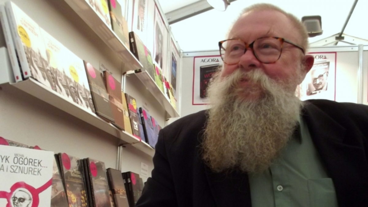 Jerzy Bralczyk żartuje podczas imprezy TVP