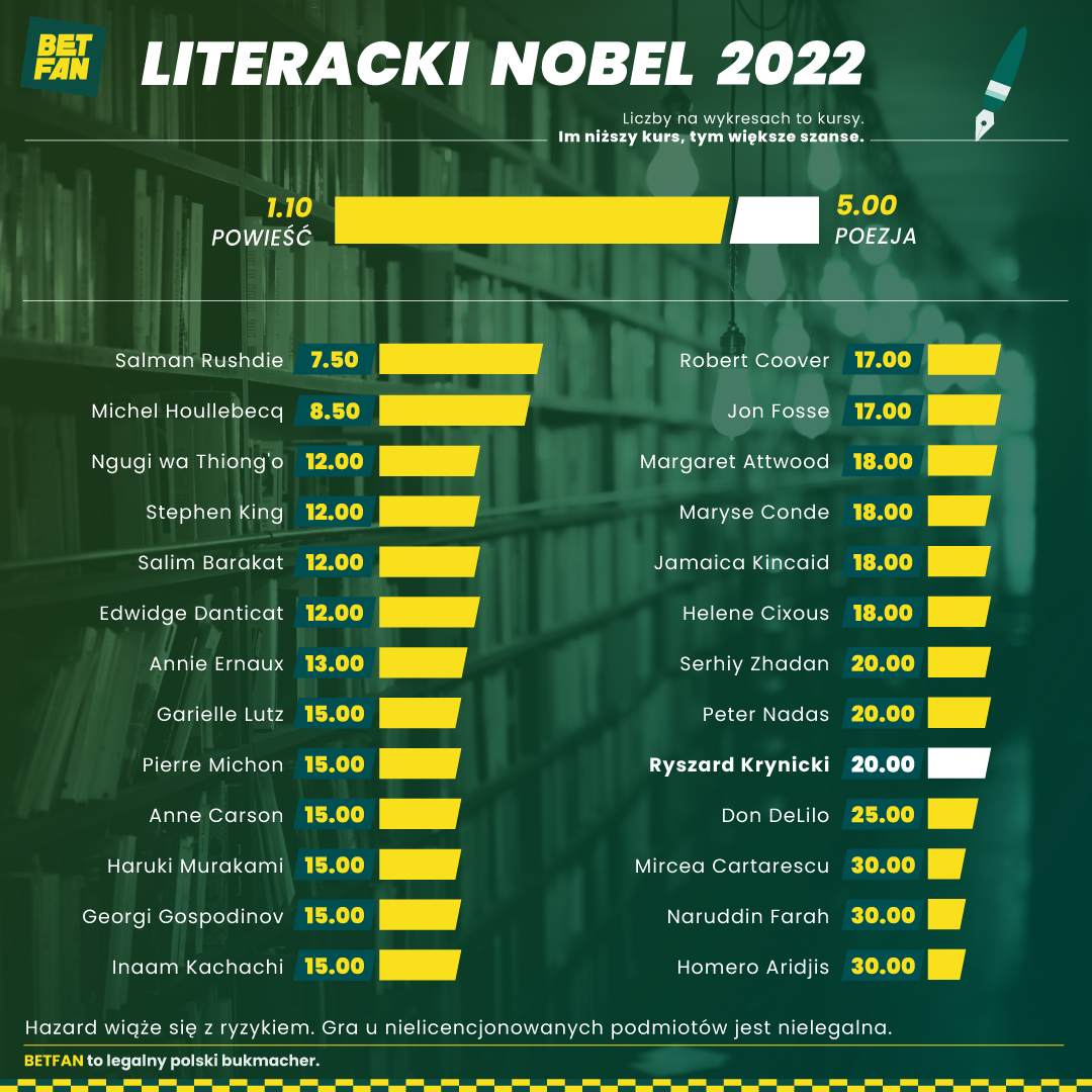 Zdaniem jednej z firm bukmacherskich, tegorocznym faworytem do Nobla jest Salman Rushdie. Wybitny dorobek literacki, a także prześladowania, z jakimi autor spotkał się w związku ze swoją twórczością, mogą odegrać szczególne znaczenie jeśli chodzi o przyznanie nagrody. Przypomnijmy, że podczas swojego wykładu w Chautauqua w Nowym Jorku, Rushdie został zaatakowany nożem. Atak związany był z jego twórczością, a szczególnie z książką Szatańskie wersety, którą część wyznawców islamu uznała za bluźnierczą. Warto dodać, że pisarz przez lata pełnił funkcję prezesa PEN America – organizacji, która stoi na straży wolności słowa. Rushdie jest również założycielem PEN World Voices Festival. Jest to największy międzynarodowy festiwal literacki w Stanach Zjednoczonych i jedyny, który koncentruje się na prawach człowieka. Literacka Nagroda Nobla dla Rushdiego oznaczałaby również nagrodę dla wolności słowa.