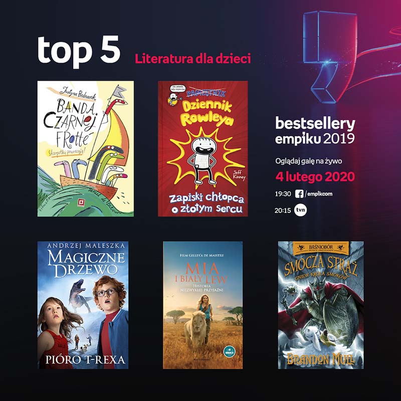 Wśród pozycji dla dzieci i młodzieży zaskoczeń nie ma. Umiarkowana popularność filmu „Mia i Biały Lew" przełożyła się na ogromną sprzedaż książki na jego podstawie – Mia i Biały Lew. Historia niezwykłej przyjaźniMagiczne drzewo Andrzeja Maleszki to cykl książek święcący triumfy od lat, a serial na jego podstawie tylko jego solidną pozycję ugruntował – nic więc dziwnego, że Pióro T-rexa otrzymało nominację. Dziennik cwaniaczka przez lata utrzymywał się na szczytach list bestsellerów, więc i kolejna książka Jeffa Kinneya oparta na podobnej formule – Dziennik Rowleya. Zapiski chłopca o złotym sercu musiała świetnie się sprzedać. Młodzi miłośnicy fantastyki chętnie sięgali po drugi tom cyklu Brandona Mulla Smocza Straż – Gniew króla smoków. Cieszy obecność na liście nominowanych Bandy Czarnej Frotte Justyny Bednarek – książki ciepłej, mądrej i naprawdę zabawnej. Pierwsza odsłona przygód skarpetek stała się lekturą szkolną. I bardzo dobrze, bo to jedna z tych książek, które raczej zachęcają niż zniechęcają młodych odbiorców do czytania.