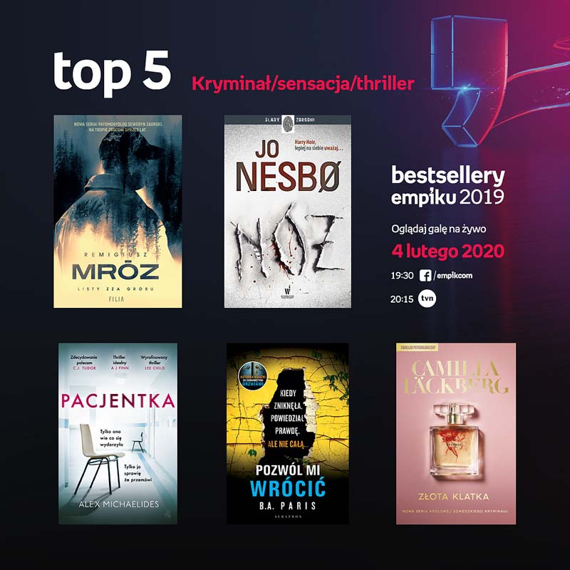 W tej kategorii zaskoczenia nie ma – Polacy stawiali na autorów sprawdzonych i lubianych. Przede wszystkim na Camillę Lackberg i jej Złotą klatkę, która jednak zdeklarowanych fanów pisarki musiała rozczarować – to bardziej powieść obyczajowa, może – psychologiczna niż thriller z prawdziwego zdarzenia. Nominację otrzymał także Nóż Jo Nesbo – i trudno się dziwić, bo choć czytelnicy spodziewali się happy endu, to w 12 (!!!) tomie cyklu powraca stary, dobry Hary Hole – pijący, mierzący się z własnymi demonami, a jednak szalenie skuteczny jako policjant. Co ciekawe, w przypadku najpopularniejszego polskiego autora powieści sensacyjnych / kryminalnych, Remigiusza Mroza, czytelnicy wybrali nie sprawdzony format opowieści o Chyłce, ale historię patomorfologa, Seweryna Zatorskiego – powieść Listy zza grobu, otwierającą zupełnie nową serię (jej kontynuacja: Głosy z zaświatów ukaże się już 29. stycznia, niedługo będziemy mogli obejrzeć też ekranizację Listów zza grobu). To powieść wciągająca i atrakcyjna, a jednak Remigiusz Mróz stawia w niej raczej na zaskoczenie – czytelnika, a może i samego siebie – niż na wiarygodność fabuły. Na liście nominowanych znalazła się także Pacjentka – raczej konwencjonalny thriller psychologiczny z nieco wymuszonym, choć bez wątpienia zaskakującym finałem, za której sukces odpowiada cała machina promocyjna Empiku. Podobną konwencję wykorzystuje B.A. Paris, autorka kolejnej nominowanej w tej kategorii powieści Pozwól mi wrócić – obie ostatnie pozycje to jednak książki mocno przeciętne.