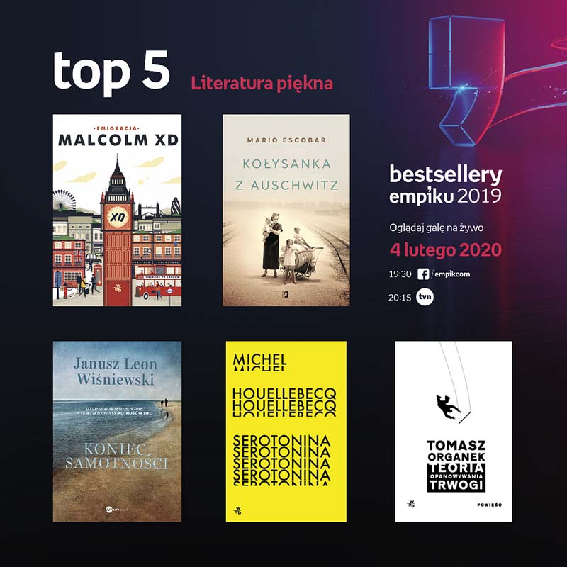 Dużo mniej wpływu kina widać w kategorii literatury pięknej. Na upartego można dopatrywać się go wyłącznie w przypadku wyróżnienia dla powieści Koniec samotności Janusza Leona Wiśniewskiego – to przecież długo wyczekiwana kontynuacja S@motności w sieci, która doczekała się ekranizacji. Cieszy nominacja dla Kołysanki z Auschwitz – nie jest to może wybitna literatura, ale wydaje się, że istnieje potrzeba tworzenia opowieści o Holokauście dla kolejnych pokoleń czytelników w formie dla nich strawnej, atrakcyjnej i współczesnej. Serotonina to wszystko, co najlepsze u Michela Houellebecqa – niełatwe tematy w formie bardzo lekkiej i atrakcyjnej dla czytelnika. W dodatku w tym przypadku również nieodparcie zabawnej, choć mówiącej o człowieku... w depresji. Dużo mniej hormonu szczęścia u krytyków pojawiło się za sprawą Teorii opanowywania trwogi znanego muzyka, Tomasza Organka, choć to w sumie książka dość przyzwoita. Kluczem do sukcesu wydaje się w tym przypadku popularność autora – podobnie jak w przy Emigracji Malkolma XD, autora kilkudziesięciu szalenie popularnych krótkich opowiadań (tzw. „past") publikowanych w sieci.