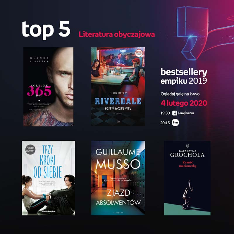 W kategorii literatury obyczajowej niepodzielnie króluje powieść Kolejne 365 dni, a więc najnowsza odsłona cyklu Blanki Lipińskiej. Na szczęście nie budzi ona już takich kontrowersji jak dwa poprzednie tomy cyklu, które można było uznać za szkodliwe i ukazujące jako naturalne postawy, których akceptować we współczesnym społeczeństwie nie wolno. Najnowsza książka Lipińskiej to – na szczęście – po prostu kolejna powieść erotyczna na naszym rynku, bardzo sprawnie promowana przez autorkę, która na marketingu zna się jak mało kto, czego dowodzi, w swoich wypowiedziach umiejętnie myląc Netflix z NextFilmem i zarzucając ludziom próby wprowadzania cenzury w XXI wieku.
