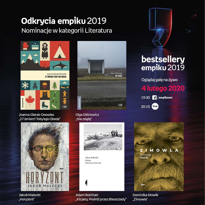 W tym roku, starając się uciec od zarzutów osób mówiących, że Bestsellery Empiku to festiwal popularności, nie zaś jakości literatury, przedstawiciele sieci zaprosili znanych dziennikarzy, by ci wskazali dzieła twórców będących na początku kariery, na które warto było w ubiegłym roku zwrócić uwagę. Udało się całkiem nieźle. Horyzont jest bez wątpienia bardzo udaną powieścią, daleką od ckliwości i sentymentalizmu, w które zdarzało się już autorowi popadać, jednak Jakuba Małeckiego trudno uznać za nowicjusza na literackim rynku. 27 śmierci Toby'ego Obeda Joanny Gierak-Onoszko to z kolei świetna reporterska opowieść, ukazująca nieznane nam epizody z historii Kanady, którą większośc Polaków uznaje za kraj zamożny, nowoczesny i tolerancyjny. Nie zdążę to również reportaż – znakomity warsztatowo, a opowiadający o... transporcie publicznym. A może przede wszystkim o ludziach, którzy z niego korzystają? Adam Robiński w Kiczerach, choć pisze o Bieszczadach, zabiera czytelnika daleko od popularnych szlaków, również skupiając się na ludziach zamieszkujących te tereny. Wreszcie – reprezentująca naprawdę dobrą literaturę piękną, oscylująca pomiędzy magią i realizmem Zimowla Dominiki Słowik. Zaryzykowałbym stwierdzenie, że po każdą z nominowanych w tej kategorii książek warto sięgnąć. I dodał ze smutkiem: niestety, inaczej niż w przypadku większości pozostałych nominowanych.