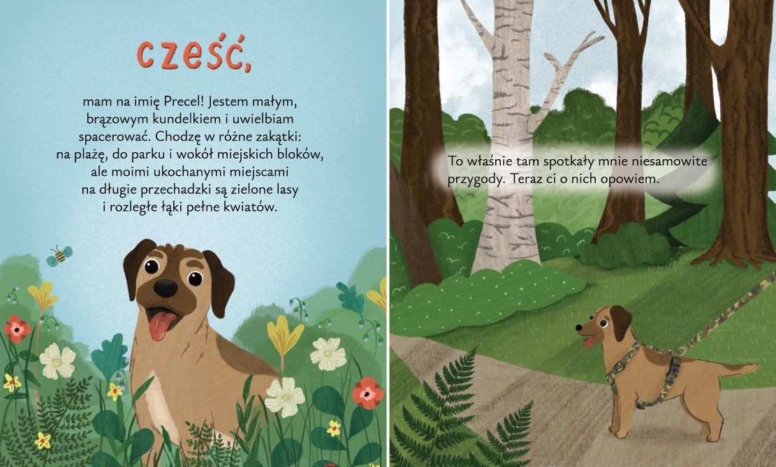 Precel idzie na spacer to już trzecia opowieść o dzielnym kundelku Preclu! Po poznaniu nowego domu nadszedł czas na spacery pełne przygód. Precel wspólnie z opiekunami wybiera się do lasu, a tam spotyka leśne zwierzęta - jeża Jędrusia i sikorkę Stefcię. Czy Precel i mieszkańcy lasu się polubią? Co może spotkać pieska na leśnej ścieżce i jak przygotować go na taką wyprawę?
