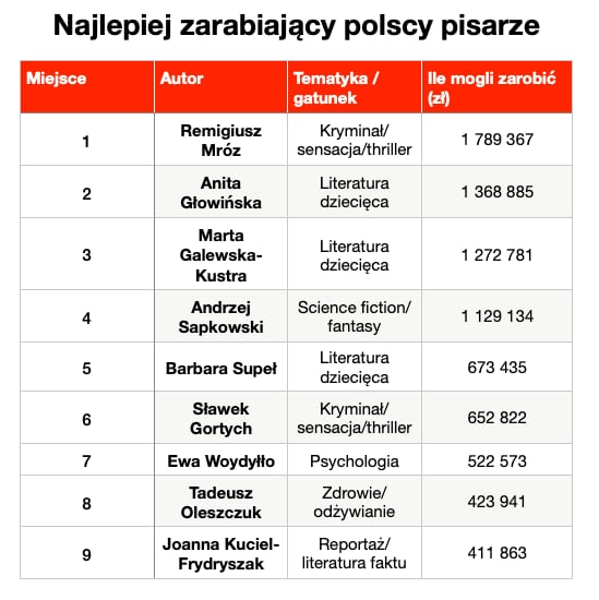 Na tle, które tworzy większość polskich pisarzy, zarabiających niewielkie kwoty, wyraźnie odcinają się autorzy najpopularniejsi. Tygodnik „Wprost" na podstawie panelu BookScan Polska prowadzonego przez firmę NielsenIQ BookData spróbował oszacować ich zarobki. I tak – zgodnie z danymi zamieszczonymi w artykule – najpopularniejszy pisarz w Polsce, Remigiusz Mróz, w 2025 roku zarobić mógł niemal 1 800 000 złotych. Tuż za nim znalazła się autorka książek o Kici Koci, Anita Głowińska, z zarobkami na poziomie 1 360 000 zł. Podium zamyka autorka książek o Puciu, Marta Galewska-Kustra. Jak widać, Polacy nie oszczędzają na zajęciach pozalekcyjnych dla dzieci, nie oszczędzają też na literaturze dziecięcej – szczególnie, że w czołowej dziesiątce najlepiej zarabiających polskich autorów znalazła się również autorka Jadzi Pętelki, Barbara Supeł (miejsce 5., prawie 700 tys. złotych szacowanego przychodu).