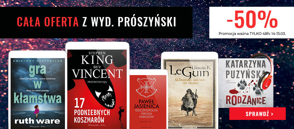 Do jutra będziecie mogli taniej zakupić pozycje Wydawnictwa Prószyński, które w formie cyfrowej doczekały się zniżek do 50%. Ofertą objęto m.in.: