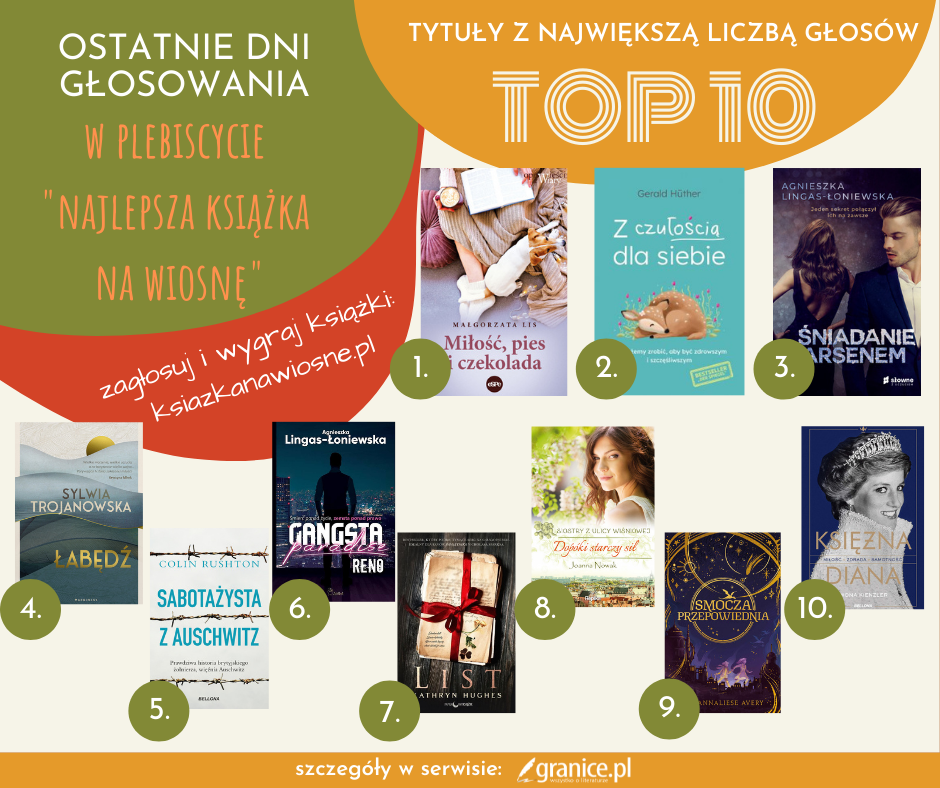 Głosowanie w plebiscycie „Najlepsza książka na wiosnę 2022" powoli zmierza do końca. Tylko do niedzieli, 3 kwietnia 2022 do godziny 23:59 na stronie ksiazkanawiosne.pl oddawać można głosy na swoich faworytów. Internauci, którzy zachęcą do głosowania największą liczbę osób, zostaną nagrodzeni zestawami liczącymi nawet kilkanaście nowości wydawniczych. Wyróżnieni zostaną również czytelnicy głosujący w plebiscycie i osoby, które nadeślą do organizatorów uzasadnienie dokonanego wyboru.