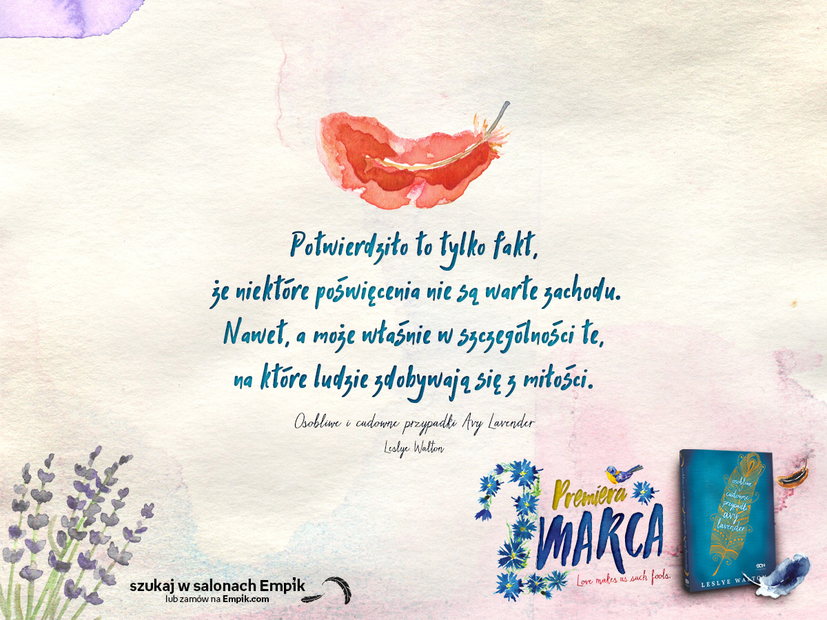 Powiesz szczerze, że oczekiwałam wiele i stawiałam wysoko poprzeczkę i nie zawiodłam się pod żadnym względem. Autorka na świetne pióro. Od pierwszych stron czytelnik przepada w tym świecie i chce znać jego wszystkie sekrety. Opisy są bardzo plastyczne, a dialogi świetnie poprowadzone. Postacie są bardzo wyraziste i wyjątkowe na swój sposób. Wprowadzenie malutkich elementów fantastycznych autorce jak najbardziej się udało. Zakochałam się w tej książce i nie będę temu zaprzeczać. Tak dobrej lektury dawno nie czytałam! Powiem Wam, że macie na co czekać w marcu :D