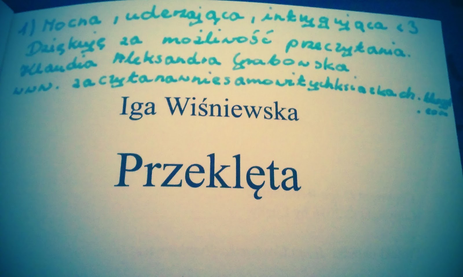 ,,Przeklęta" otumani wasze zmysły, sprawi, że serce zabije szybciej oraz wkradnie się w wasze łaski. Mocna, intrygująca, zaczarowana. Nie można przy niej przejść obojętnie. Cieszę się, że miałam możliwość jej przeczytania. Nie zawiodłam się. Tak jak mówiłam już wcześniej, niezbyt często czytam polskich autorów. Kiedy sięgałam po jakąś ich książkę, kończyłam ją zawiedziona. Zawsze odczuwam irracjonalny strach przed kolejną próbą. A tu proszę -- najpierw K. N. Haner a teraz pani Iga sprawiły, że zmieniam zdanie. ,,Przeklęta" była inna, niż się spodziewałam, ale na lepsze. Nie mogłam się od niej oderwać i z niecierpliwością śledziłam losy bohaterów oraz zagryzałam wargi w niebezpiecznych momentach. Książka jest nieprzewidywalna, cały czas się coś dzieje. Spodobało mi się, że autorka przedstawiła historię z różnych perspektyw. Narrację prowadzi wielu bohaterów, co dodaje niezwykłości powieści. Jako że uwielbiam mitologię, ogarnęła mnie ogromna radość, ponieważ pojawiały się w niej takie wątki. Pisarka zakończyła książkę, w taki sposób, że do tej pory myślę o tym. Nie wiem, czy wytrzymam do kontynuacji. Nie wolno kończyć historii w tym momencie. Serca czytelników mogą tego nie wytrzymać. Cały czas się tu coś dzieje, postacie porażają charakterem, a historia intryguje swoją złożonością. Przygotujcie się na dużą dawkę emocji oraz zawczasu postawcie przed sobą dzbanek herbaty lub kawy. Przyda wam się, bo nie będziecie mogli odłożyć ,,Przeklętej" na bok. Zachwyci was i nie pozwoli zmrużyć oka. Niesamowita!