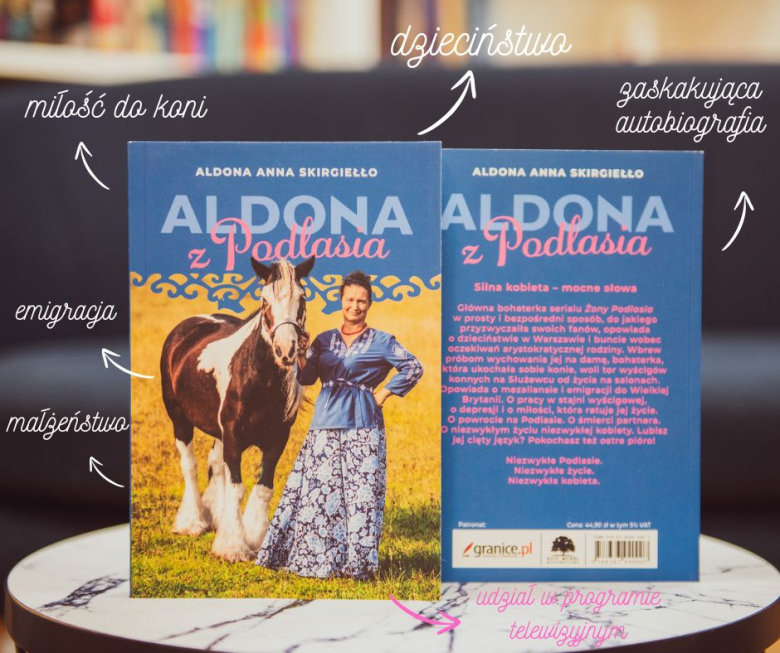 Aldona Anna Skirgiełło pochodzi z wileńskiej arystokracji i od dzieciństwa była wychowywana przez swoją babkę, pierwszą polską stewardessę, która marzyła o uczynieniu z niej wielkiej damy. Już jako dziewczynka sprzeciwiała się konwenansom, rezygnując z nauki francuskiego i gry na pianinie, by poświęcić się swojej pasji – jeździectwu, które stało się kluczową częścią jej życia. W dorosłym życiu zmagała się z trudnymi relacjami, jej partnerami były osoby uzależnione i przemocowe, co przyniosło jej wiele bolesnych doświadczeń. Po latach spędzonych w Anglii wróciła do Polski i osiadła na Podlasiu, gdzie przeżywała kolejne wyzwania, łącząc swoje pasje z przezwyciężaniem codziennych trudności. Później stała się gwiazdą programu telewizyjnego „Żony Podlasia". Jej autobiografia to szczera i bezkompromisowa opowieść o odkrywaniu siebie, dokonywaniu rachunku sumienia i poszukiwaniu odpowiedzi na najtrudniejsze pytania. Rozmawiamy z Aldoną Anną Skirgiełło, autorką książki Aldona z Podlasia.