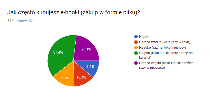 Aż 37,4% osób zadeklarowało, że często (kilka lub kilkanaście razy na kwartał) kupuje e-booki. Co ciekawe, 11,2% odpowiedziało, że nigdy nie kupuje książek elektronicznych, choć książki w takiej właśnie formie czyta.