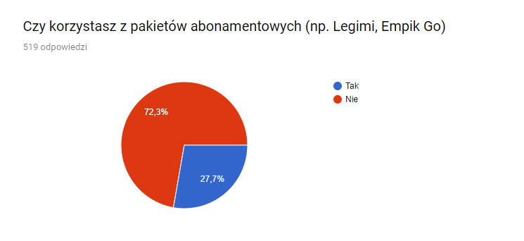 A co z pakietami abonamentowymi? O to także zapytaliśmy internautów. Jak się okazuje, aż 96,5% osób, które wcześniej zaznaczyły, że czytają książki także w formie abonamentu, korzysta z pakietów spółki Legimi. Popularna usługa zdeklasowała konkurencję!