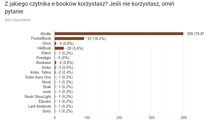 Użytkownicy czytników wybierają zaś raczej urządzenia od Amazonu. 79,8% odpowiadających deklaruje, że czyta książki na Kindle'ach. Zaraz po nich króluje PocketBook z 18,3%. 5,6% użytkowników czytników to posiadacze InkBooków, 1,2% to zaś użytkownicy czytników marki Kobo. W jednostkowych odpowiedziach pojawiają się także Kiano, Nook, Lark czy… Sony.