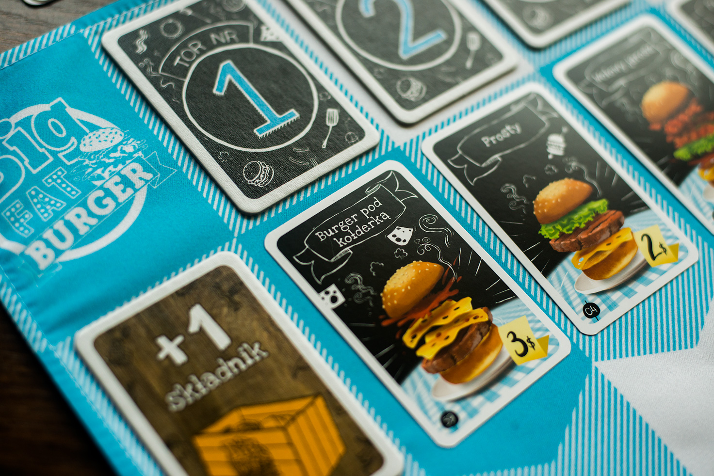 Na uwagę zasługuje staranność wykonania zestawu, który składa się z wykonanych z grubszego kartonu 5 kart bonusów i 4 kart torów oraz wydrukowanych na dość sztywnym papierze 85 dwustronnych kart zamówień / składników (awers przedstawia burgera, którego należy wykonać, rewers - jeden ze składników do wykorzystania), 24 kar specjalnych, karty pierwszego gracza, kart postaci i bonusów. Są też żetony graczy, służące do rezerwacji zamówień. Te elementy wykonane są starannie, estetycznie zaprojektowane i rzeczywiście wpisują się w stylistykę modnych burgerowni. Uśmiech wzbudzić muszą oryginalne, niektóre - naprawdę dowcipne nazwy poszczególnych burgerów („Krowa na wypasie”, „Ser w międzymięsiu” czy „Podstępny namakacz”). Najbardziej pomysłowym jednak elementem zestawu jest plansza, tę rolę bowiem pełni naprawdę ładnie wykonany materiałowy obrus (uwaga dla pedantów: tak, można go wyprasować, co zresztą uczyniliśmy przed wykonaniem dla Was zdjęć). Całość zamknięta jest w pudełku raczej standardowej wielkości. Materiały, z których wykonano poszczególne elementy, gwarantują, że całość raczej nie ulegnie szybkiemu zniszczeniu.