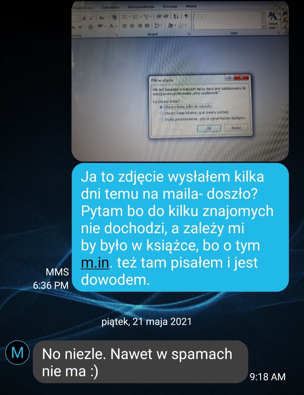 Dlatego też wielu z nieukrywanym uśmiechem i niedowierzaniem przyjmuje pojawiające się z rzadka informacje, że aniołowie to niesamowicie inteligentne byty, doskonale odnajdujące się w świecie współczesnej technologii. Ja zaś jestem o tym swięcie przekonany. Sam bowiem miałem kilka tego typu doświadczeń z aniołami, ale akurat tymi „z ciemnej strony mocy”. Nie miało to nic wspólnego z „wesołymi rogatymi diabełkami”, jak niektórzy lekceważąco postrzegają szatana. Opisałem zresztą te przypadki w swej książce Demon, mówię jak jest. Aby jakoś bardziej uwiarygodnić opisywane w książce historie, zamieściłem tam również m.in. zdjęcie ekranu mojego laptopa. Niespodziewanie pojawiła się tam bowiem informacja o dziwnej blokadzie na pisany akurat w Wordzie artykuł o satanizmie. Blokada, którą mi zrobił – jak tam czytamy – „inny użytkownik”. Żeby było ciekawiej, ja jestem jedynym użytkownikiem mojego laptopa, a zrobionego komórką zdjęcia ekranu przez dłuższy czas nie dało się nikomu wysłać, dochodziły tylko puste maile. W końcu udało mi się wysłać to zdjęcie wydawcy w formie MMSa – i doszło. Pokażę zresztą Panu, co mi wówczas na to odpisał.