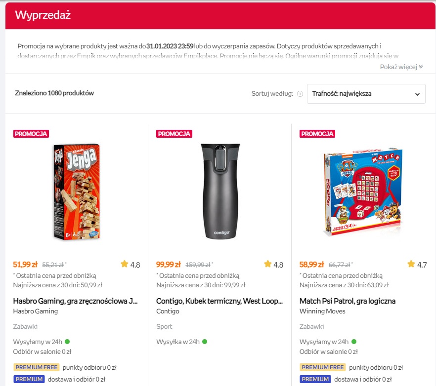 Na pierwszy ogień jedna z najpopularniejszych marek w Polsce – Empik. W Empiku na stronie książek objętych promocją widzimy jedynie porównanie do cen proponowanych przez wydawcę. Po wejściu jednak w sekcję „Wyprzedaż”, obejmującą produkty takie, jak zabawki, akcesoria sportowe, obuwie i odzież, da się zauważyć, że trzecia cena każdego pojedynczego produktu znajduje się na liście artykułów wyprzedażowych.