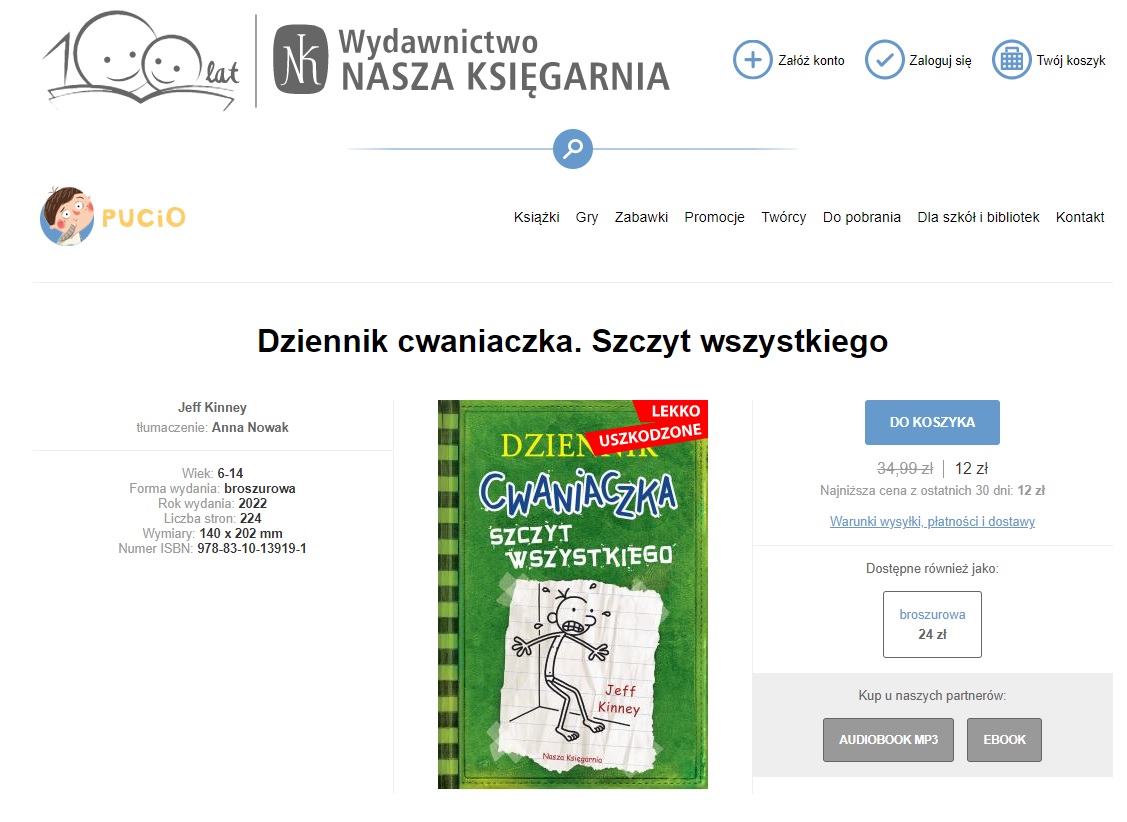 E-sklep Wydawnictwa Nasza Księgarnia również postanowił zamieścić informację o trzeciej cenie przecenionej książki dopiero po wejściu na jej stronę internetową, ale za to w widocznym miejscu, obok produktu. Co więcej, cena została dodatkowo oznaczona pogrubionymi literami, aby zwracać uwagę klientów.