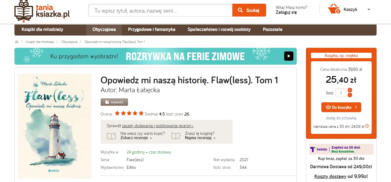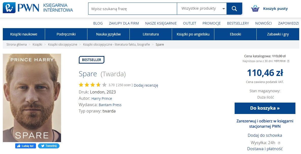 Po wejściu na konkretną książkę nietrudno znaleźć informację na temat trzeciej ceny, ponieważ znajduje się ona w oznaczonej kolorem pomarańczowym ramce wraz z ceną początkową oraz obecnie obowiązującą. Mimo iż została napisana najmniejszą czcionką spośród pozostałych trzech, nie stanowi to wielkiego utrudnienia.