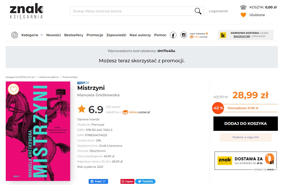 Wybierzmy się teraz do księgarni znak.com.pl. Pierwsze, co rzuca się w oczy po wejściu na stronę główną, to baner, na którym e-księgarnia bez obaw umieściła obniżki procentowe odnoszące się do książek. Po kliknięciu trafiamy na listę książek, jednak trzeciej ceny brak. Dopiero po przejściu na stronę konkretnego produktu sytuacja ulega zmianie: