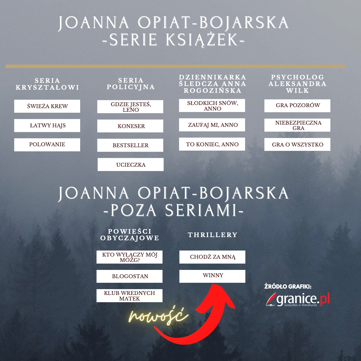 Czy wiedzieliście, że w ciągu 10 lat swojej twórczości (które świętować będzie dokładnie 11 października 2021 roku) Joanna Opiat-Bojarska napisała już 18 książek? Co więcej, stworzyła w tym czasie aż 4 różne serie powieściowe! W jakiej kolejności czytać Opiat-Bojarską? Jakie serie książek napisała ta popularna autorka? Przy okazji premiery najnowszej książki autorki – thrillera Winny – przedstawiamy krótki przewodnik po seriach i książkach Joanny Opiat-Bojarskiej.