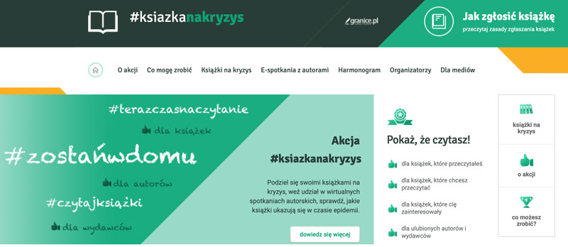 Wydawałoby się, że w okresie, gdy obowiązuje zakaz organizowania imprez kulturalnych, życie literackie powinno niemal ustać. Jest zupełnie inaczej. Kolejni pisarze udostępniają w sieci swoje opowiadania, organizowane są wirtualne spotkania autorskie i czaty z czytelnikami. To, jak bardzo jest ich dużo, doskonale pokazuje nasza akcja #ksiazkanakryzys Na jej stronie internetowej prezentujemy codziennie aktualizowaną listę spotkań autorskich wraz z linkami. Internetowa forma spotkań ma jeszcze jedną niewątpliwą zaletę. Choć nie poprosimy ulubionego pisarza o autograf, możemy wybrać się na spotkanie z nim nawet wówczas, gdy mieszkamy kilkaset kilometrów od miejsca, gdzie się ono odbywa. Nie ma już mowy o wykluczeniu z powodu mieszkania daleko od wielkich miast czy instytucji kultury. O ile tylko mamy dostęp do sieci.