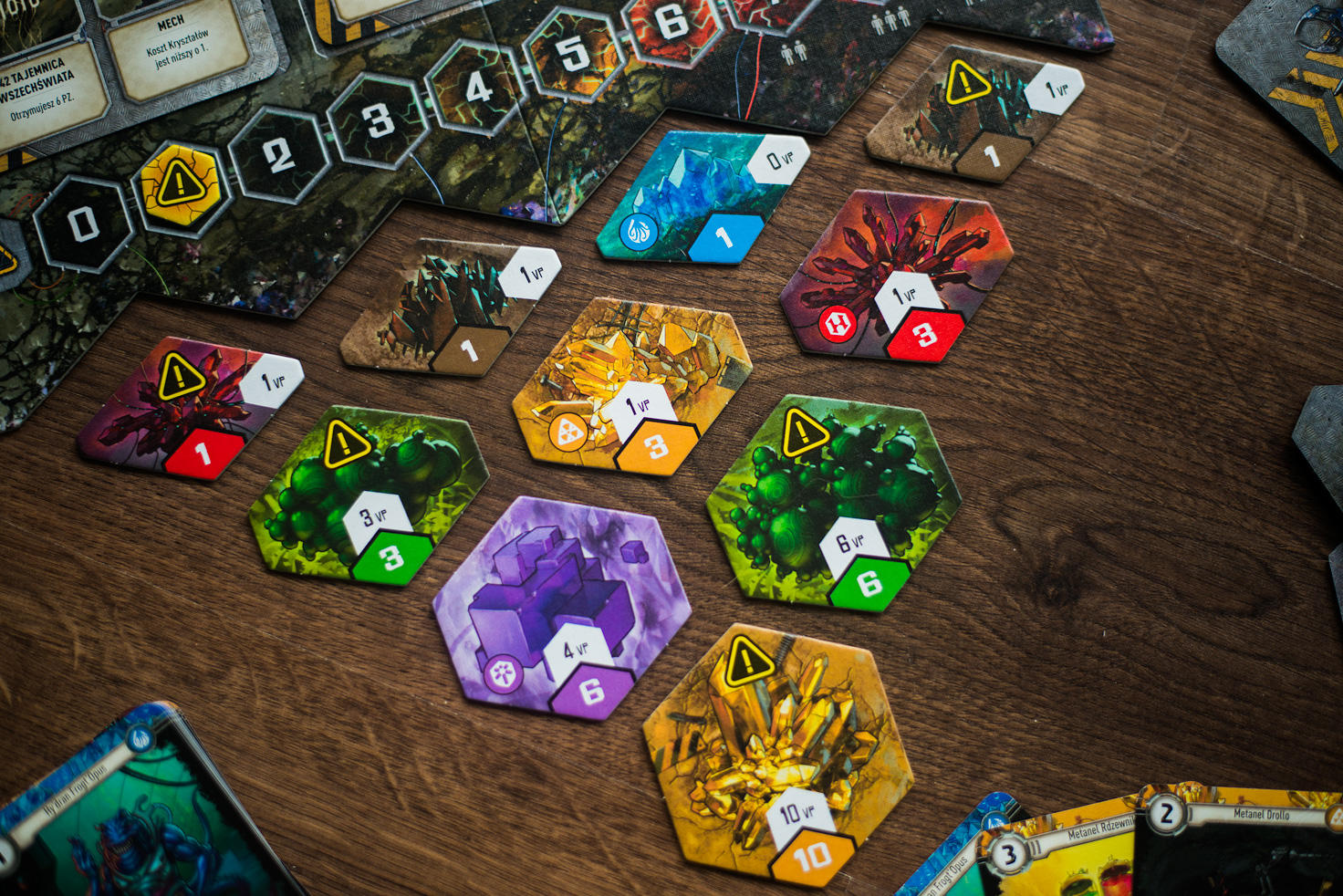 2. Fedrowanie kryształów – aby wziąć żeton kryształu z dolnej piramidy, należy zagrać kartami w kolorze i o wartości wybranego kryształu, jeśli posiadamy totem w kolorze interesującego nas kryształu, koszt jego wydobycia obniża się o 1. Kryształy w dwóch kolorach, których frakcje nie biorą udziału w danej rozgrywce, można fedrować za pomocą kart w innym kolorze.