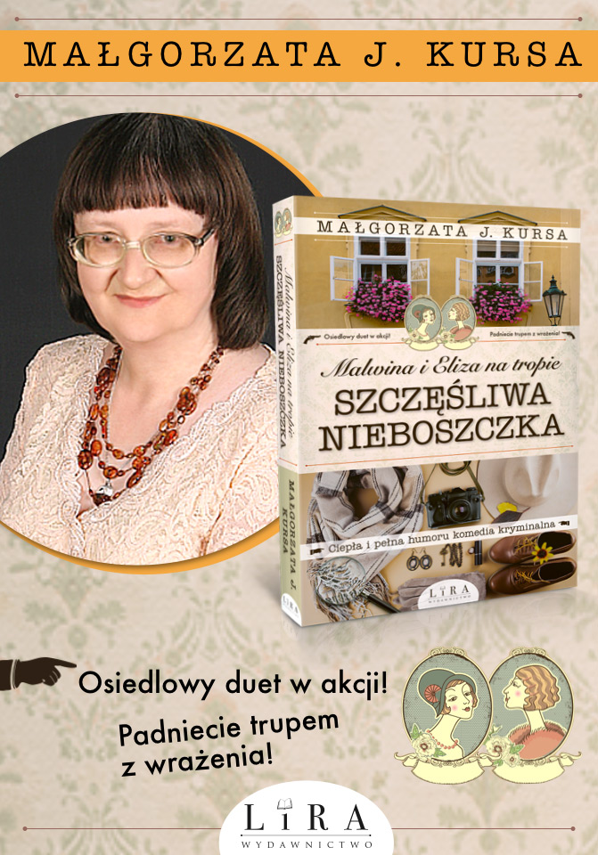 Data: 2019-11-23 13:03:32– Po lekkie, dowcipne kryminały sięgamy, bo tęsknimy za normalnością. Śmiech zawsze był katalizatorem. Już za PRL-u dobrze o tym wiedziano i pozwalano narodowi się pośmiać. Każdy potrzebuje relaksu i oddechu od własnych problemów. Każdy potrzebuje oswojenia codzienności. A co działa lepiej niż śmiech? – mówi Małgorzata Kursa, która wydała właśnie książkę Malwina i Eliza na tropie. Szczęśliwa nieboszczka (Wydawnictwo Lira). To historia dwóch pięćdziesięcioletnich pań, które nie mogą uwierzyć w to, że ich wyjątkowo szczęśliwa sąsiadka popełniła samobójstwo. Prowadzą więc prywatne śledztwo, uczestnicząc w ciągu przezabawnych zdarzeń.