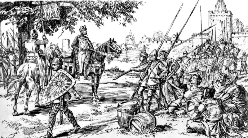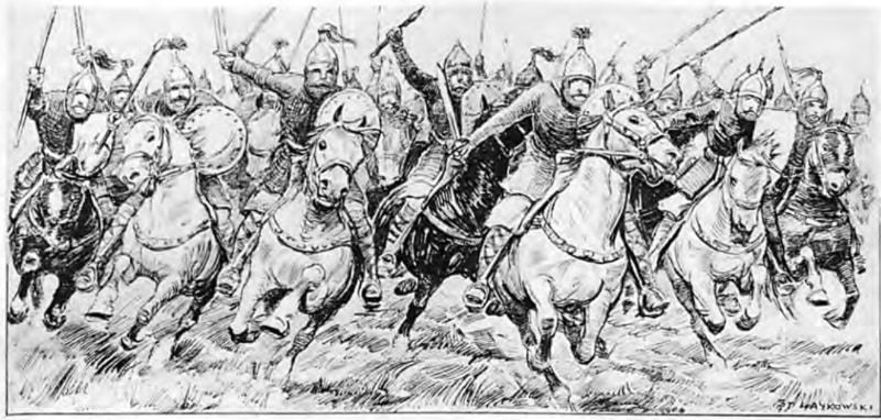 Drużyna Bolesława Chrobrego w natarciu. Stanisław Haykowski, ilustracja w książce Księga Jazdy Polskiej, Bydgoszcz 1938.