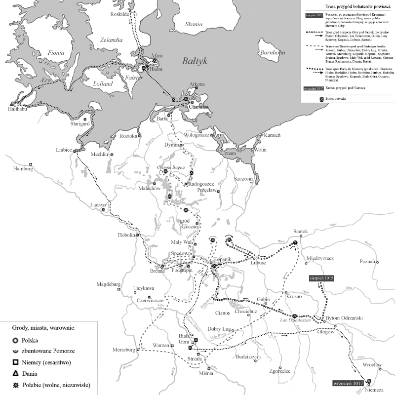 Mam nadzieję. W ciekawe czasy i miejsca, wypełnione interesującymi postaciami i wydarzeniami. W Polsce władanej przez Bolesława Chrobrego toczyły się powiązane nawzajem procesy wewnętrzne, na przykład utrwalanie granicy państwa, stabilizacja chrześcijaństwa, ugruntowanie systemu feudalnego, oraz zewnętrzne, jak rozwój stosunków z krajami ościennymi. W Niemczech i cesarstwie feudalizm wchodził w fazę destabilizacji, spowodowanej tendencjami decentralistycznymi kierowanymi przez możnowładztwo. Pomiędzy Polską a cesarstwem leżały kraje słowiańskiego Połabia, pogrążone we własnych konfliktach. Na tym tle – historyczne podłoże i historyczne postacie – przedstawione są przygody bohaterów powieści, postaci fikcyjnych, odgrywających role pierwszoplanowe.