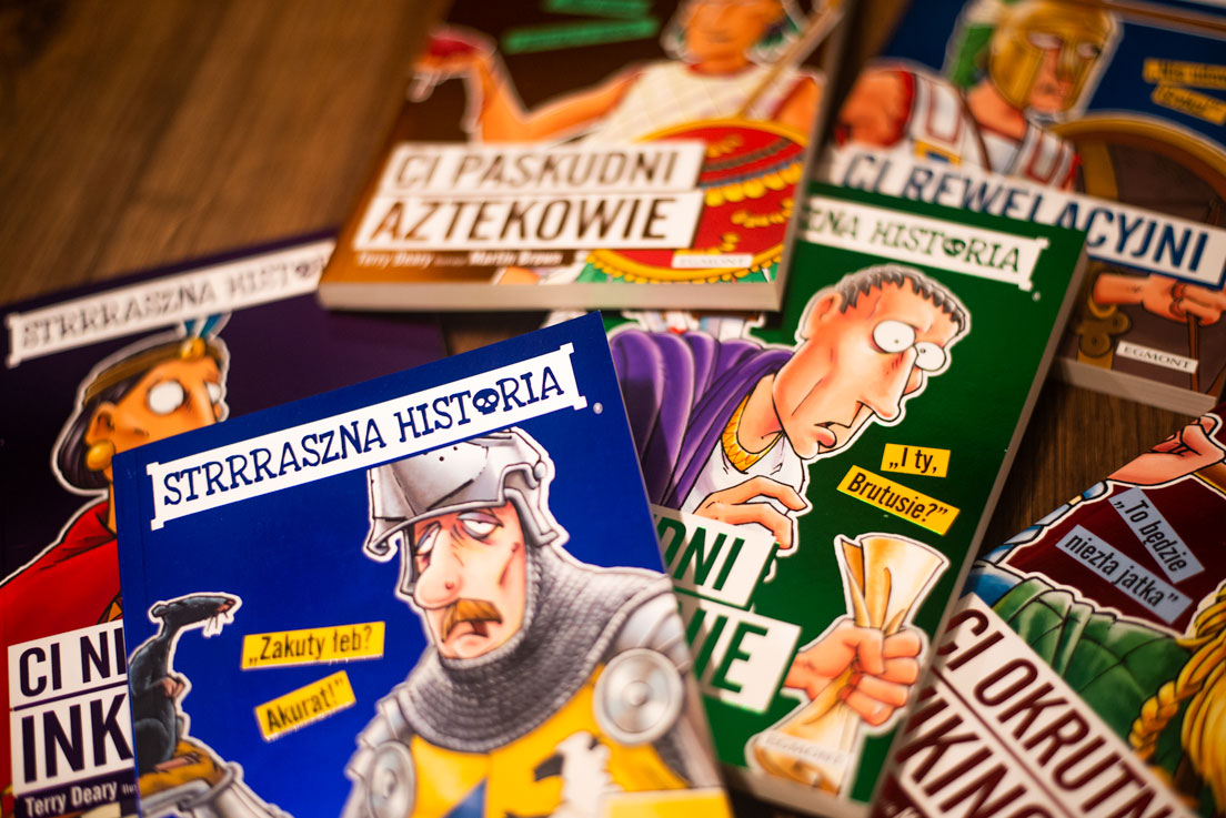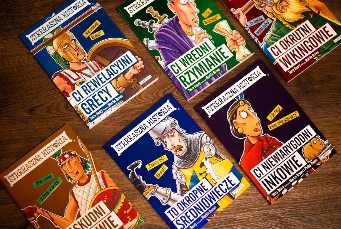 W latach 90. ubiegłego wieku (zapiszmy to na kartach naszej historii najnowszej) Terry Deary wraz z ilustratorami, Martinem Brownem i Philipem Reevem, stworzyli serię dla dzieci i młodzieży, która ma na celu opowiedzenie historii poprzez fakty mniej znane, a przez to niezwykle ciekawe i dające możliwość wprawienia nudnego belfra w zakłopotanie. Tytuł serii – Strrraszna historia – nie tylko sugeruje, że odkryje przed nami potworne dzieje, o których na lekcjach się nie opowiada (a przecież to okropności wydają się najciekawsze), ale też zapowiada, że karierę nauczycielską naszego historyka dzięki podpowiadanym przez autora pytaniom zamienimy w koszmar.