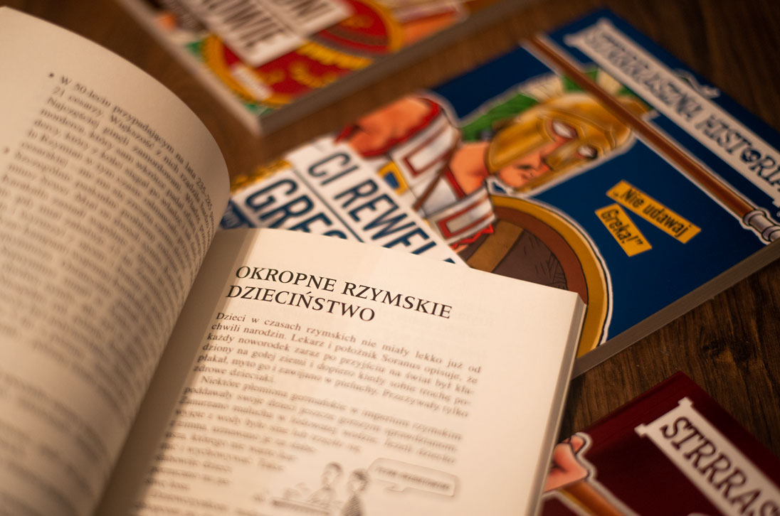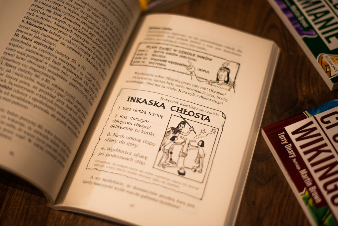 Co w tych książkach jest atrakcyjnego? Poza wspomnianą już dawką wiedzy, która wykracza poza zakres podstawy programowej lekcji historii, a jej znajomością można zakłopotać niejednego belfra, jest oczywiście forma podania. Książki liczą około 120 stron, więc nie odstraszają młodych czytelników objętością. Ponadto karty nie są gęsto zadrukowane tekstem, gdyż mniej więcej połowę powierzchni zajmują zabawne rysunki i paski komiksowe. Te często sarkastycznie ilustrują alternatywną historię lub dodają pikanterii tej autentycznej. To nie wszystko! Książki aktywizują czytelnika poprzez zagadki i quizy, które pobudzają wyobraźnię, sprawdzają wiedzę szkolną (lub wyniesioną z lektury) lub zachęcają do sprawdzenia znajomości tematu u nauczyciela. Czasami pojawią się jeszcze zadania eksperymentalne – należy je jednak traktować z przymrużeniem oka, bo nie wyobrażam sobie sytuacji, gdy jakiś nastolatek rzeczywiście zacznie kopać ziemię w ogródku, by przekonać się, jak smakuje ziemia albo jak duszno jest pod nią.