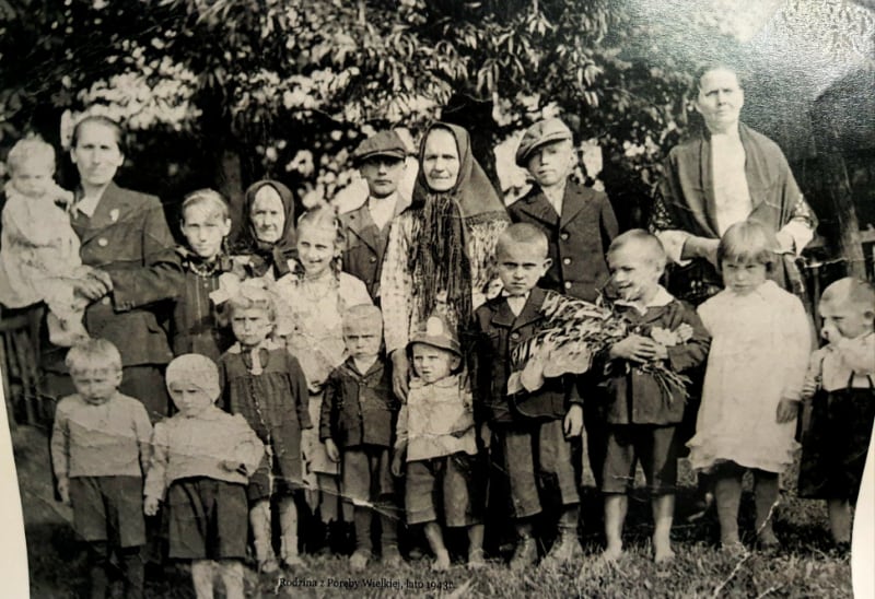 W górnym rzędzie od lewej: Franciszka Kulig z małym Wawrzyńcem Kuligiem na rękach, sąsiadka Józefa Filip, sąsiadka Wiktoria Drabczyk (w chuście), Kazimierz Żmuda (w kaszkiecie), Wiktoria Żmuda (w chuście), sąsiad Ignacy Brombosz; Wiktoria Drabczyk (opiekunka dzieci Kuligów podczas pobytu Franciszki w obozie, została z rodziną do końca wojny, gdyż jej mąż zginął od zabłąkanej niemieckiej kuli). W dolnym rzędzie: syn sąsiadów Błażej Janus, bratanek Franciszki Stanisław Żmuda, Maria Kulig (z kokardą we włosach), Stefania Kulig, Eugeniusz Magiera, Mietek Magiera, Błażej Magiera, sąsiad Stanisław Dźwigoński, córka sąsiadów Stanisława Brombosz i bratanek Franciszki Roman Żmuda