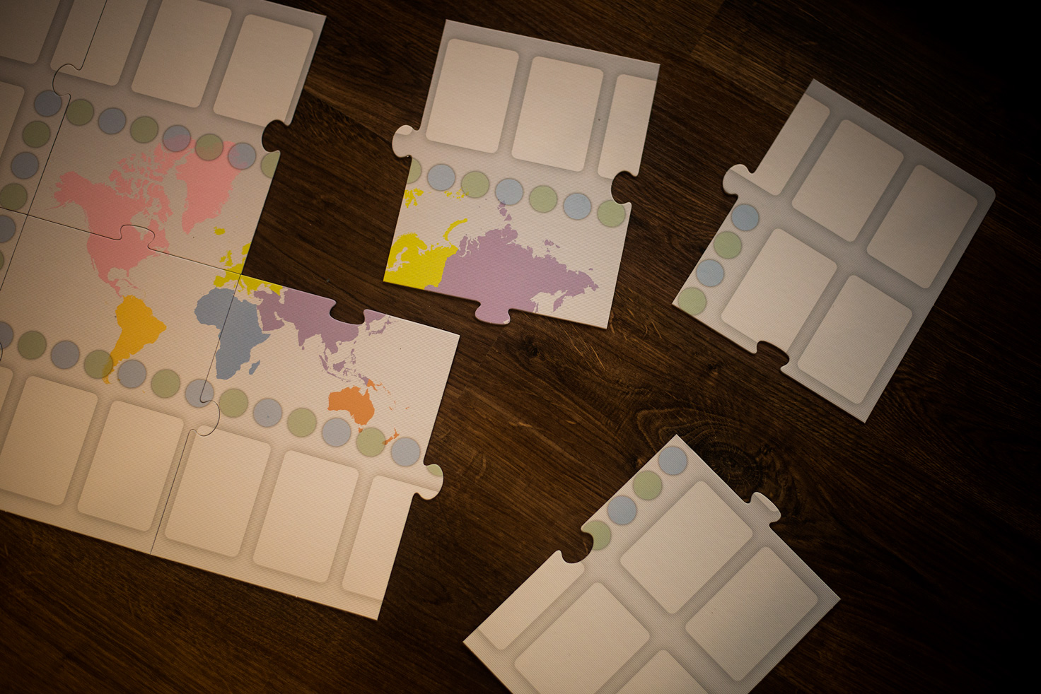 W skład zestawu wchodzi przede wszystkim większa niż standardowo kartonowa, solidna plansza. Co ciekawe - w tym wypadku nie jest ona składana, lecz w formie… puzzli. Zdobi ją kula ziemska pokryta flagami oraz przestrzeń, na której toczyć się będzie rozgrywka z polami punktacji i mapą świata. Projekt jest dość prosty, lecz uporządkowany i przemyślany. W zestawie znajdziemy także 195 kart państw, stosunkowo miękkich, więc wskazana jest delikatność w obchodzeniu się z nimi. Awers zdobi flaga (co bardzo ważne, twórcy gry zadbali o umieszczenie na tej stronie strzałki, wskazującej właściwy kierunek ułożenia karty - w przypadku mniej znanych flag państw może się to okazać bardzo pomocne), rewers zawiera trzy pytania. W pierwszym należy wskazać państwo, którego flagę widzimy na drugiej stronie, drugie pytanie zwykle dotyczy stolicy, trzecie zaś - wiedzy o danym państwie. Znajdziemy tu pytania o liczbę ludności czy najwyższy szczyt danego kraju, bywają też pytania, w których musimy rozpoznać, które zdanie o danym państwie jest prawdziwe, a które fałszywe. Ostatnim elementem zestawu jest 36 pionków - po 6 w sześciu kolorach. Pionki wykonane są z plastiku i przypominają postaci ludzkie - każda z nich ma wyraźną główkę, oczy, usta i ręce.