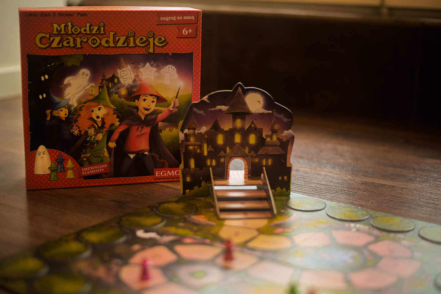 W tym miejscu trzeba się jednak zatrzymać, bo proste wyliczenie zupełnie nie oddaje atrakcyjności graficznej kolejnej propozycji Egmontu. Powiedzieć bowiem, że zestaw jest starannie wykonany, to właściwie nic nie powiedzieć. Nie ma tu królującego w świecie planszówek plastiku, a poszczególne elementy są dopracowane w najdrobniejszych nawet szczegółach. Zamiast tradycyjnej mety mamy trójwymiarowy model szkoły magii, który cieszy oko i przykuwa uwagę także najmłodszych uczestników zabawy. Pionki rzeczywiście przypominają sylwetki małych czarodziejów, wieńczą je szpiczaste kapelusze. Symbole świetlików są niebanalne, lecz przy tym bardzo czytelne i wyraziste - zupełnie nie sposób ich pomylić. Również na planszy znajdziemy wiele drobnych elementów, swoistych „smaczków”, nawiązujących do świata baśni. Duszki przypominające hatifnaty z bajki o Muminkach, porozrzucane na planszy dynie, żaba w koronie, kwiatki i grzybki nie mają wprawdzie wpływu na samą grę, a jednak sprawiają, że po prostu przyjemnie jest patrzeć na planszę, pozwalają też z łatwością przenieść się w świat stworzony przez twórców gry.